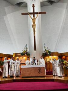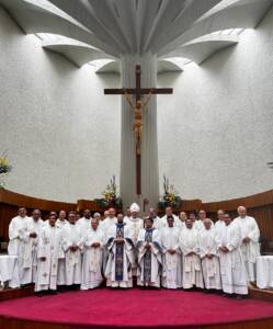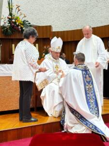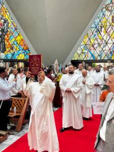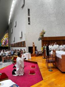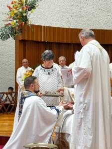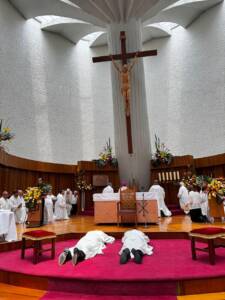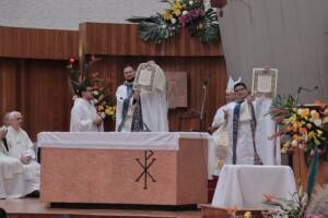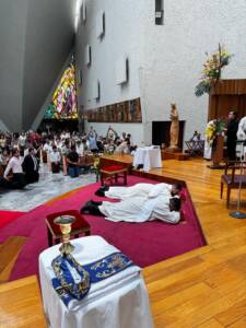 Siguió el rito central con la Súplica Litánica o Letanía de los Santos para que intercedan por los ordenandos, en ese momento éstos se postraron en tierra en señal de humildad, de amor y de entrega a Dios quien los ha llamado; también forman parte de este fase la imposición de manos por parte del obispo y los sacerdotes que acompañaron el evento y la oración consagratoria.