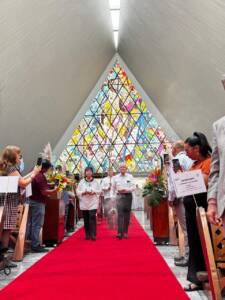 No podemos dejar de destacar la labor del equipo que se formó para poder recibir a todos los invitados a esta magnífica celebración, el trabajo que se llevó a cabo incluyó desde limpieza profunda del templo, elaboración de arreglos florales y decoración del interior del salón San Agustín así como del atrio, acondicionar dos salones para que los familiares de los ahora sacerdotes pudieran cambiar su atuendo (ya que vienen de un largo viaje en autobús), apoyo a la celebración litúrgica, asignación de labores de servicio de comida y bebidas, limpieza de todas las áreas y otros detalles más, así como difusión del evento; queríamos que todos los invitados se sintieran acogidos y el sentir general así fue; una calurosa felicitación a todos los participantes en esta labor de amor y entrega a Dios y al prójimo.