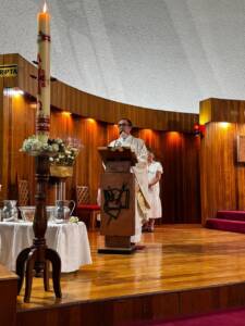 Fue proclamado el evangelio  de  San Lucas, en la parte que corresponde a  la Resurrección del Señor,  la homilía que nos dirigió fray Melchor Benito, Benito, nuestro rector, hizo énfasis en que celebramos la Pascua y Pascua es paso, hoy  celebramos la Pascua de la creación en la lectura del Génesis, la Pascua de la libertad, el pueblo de Dios sale de Egipto, con ello, de la esclavitud y el Señor le acompaña y  la Pascua de la santificación, ya que Jesús con su muerte y resurrección nos trae una forma de salir del pecado a la gracia. Dios reafirmó a Jesús, si vivimos como Él, viviremos como Él, si morimos como Él, resucitaremos con Él; Dios nos tiende la mano constantemente, Él es luz, bondad, belleza, Dios nos amó, perdonó nuestros pecados y nos dio la vida eterna, recordó que la Pasión de Jesús es una experiencia de purificación y sanación para el género humano, ya que Él estaba libre de pecado; Dios nos amó, nos perdonó y nos dio nueva vida en Cristo.